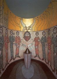 Wenn man die Kirche betritt, fallen sofort zwei Dinge ins Auge - der Altarraum und die großen bunt verglasten Fenster. Der Altar hat die Form eines Sarkophags. Das große Kreuz darüber wurde von Prof. Schreiter geschaffen. Links hängt eine Ikone, die eine Gemeindegruppe 1966 von einer Reise in die damalige Sowjetunion mitbrachte. Sie stellt die Verklärung Christi dar. Rechts über dem Lesepult hängt eine kleine Mutter - Gottes Ikone; in der Passionszeit ist dann dort eine Dornenkrone zur Erinnerung an den Leidensweg Jesu Christi.